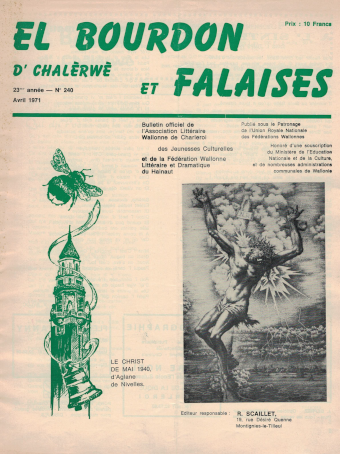 A l' sinte Babe (dins l' timps passé) - François Lorent (page: 2) A m' vîye maujo - Victor Byloo (page: 2) Qui dji r'véns co la d'sus ! - Jules Thibaut (page: 3) Rivadjeuses - Fédora (page: 3) Une belle figure de Wallonie - Omer Bastin - Armand Deltenre (page: 4) Surprîje - Fernand Dupont (page: 8) Les Paters - C. Simon (page: 8) L'amoûr, c'è-st-ène rôse (chanson) - Louis Lecomte (page: 8) Pouqwè nén l' dîre ? - Raoul Waselle (page: 8) Li fantaume - C. Simon (page: 9) Les inondations - Fichau (page: 9) L'ombe - François Gianolla (page: 9) Quand l'amoûr tchante… - Maurice Neuville (page: 9) Poésie et relations sociales - Raymond Bath (page: 10) Fugue - Michel Duprez (page: 10) La Guyane Française - Jean-François De Ville (page: 11) Sans titre - Cécile Cloutier (page: 11) Révolte d'un vivant - Robert Manduau (page: 11) Quelques scènes bibliques dans l'œuvre de Georges Aglane de Nivelles - Raymond Bath (page: 12) Regrets de jeunesse - André Volmering (page: 13) André Burton à Bruxelles - R. Finet (page: 13) L'abîme appelle l'abîme - Tina Sol (page: 14) Un naïf - R. B. (page: 15) El Printemps èyèt Tapilux - El Picron (page: 16) |
