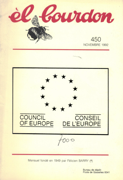 La Charte européenne des langues régionales et minoritaires - Jean-Luc Fauconnier (page: 4) Wètéz l' mayeûr - Emile Lempereur (page: 7) Enn'aller… - Lisa Chastelet (page: 7) Dins nos-Ardènes - Joël de Bachy (page: 8) Tout seû - Pol Bossart (page: 8) Li liève èyèt l' tôrtuwe - Oscar Balériaux (page: 9) Lès twès-ôwes - Arlette Dauphin (page: 10) Mérote - Marie-France Fichet-Doffiny (page: 11) In mouchon m'a tchîp'lè - Robert Stainier (page: 11) Mârîye - Fédora (page: 12) In fameûs pècheû - Noëlla Martin (page: 13) Du timps qu' dj'èsteu djône ome - Robert Bauffe (page: 14) Ratinde (chanson) - Yvette Juskowiak (page: 15) D'ssu l' pîre dè l'uch (chanson) - François Lemaire (page: 16) On n'a qu'ène vîye - Yvette Léonard (page: 17) Nîve - Ghislain Nicolas (page: 17) Au moukèt muchi dins nos pouyes - Robert Mayence (page: 18) Pal bawète d'èm guèrnî - Renée Schelfhaut (page: 19) El compte - Emile Van Aelst (page: 19) Rousèye d'iviêr - Josée Mathot-Spinosa (page: 20) El fauve dèl cuvèle (2) - Ernest Lefèvre (page: 21) Amon l' s-ôtes - Vèrsets jèrriais - Edwin-J. Luce (page: 23) Qwè d'jèz (5) - Achille Van Calsteren (page: 25) Qué dalâdje (74) - Ce (pronom démonstratif entre consonnes) - Jean-Luc Fauconnier (page: 26) C'était la modestie même (Marthe Oemkens) - Inconnu (page: 28) Albert Rousseau n'est plus - Inconnu (page: 30) |